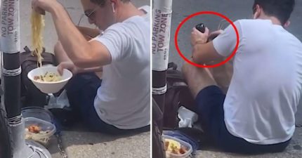 影/外送員路邊「徒手挖麵偷雞肉」 路人看傻:還自備釘書機封裝